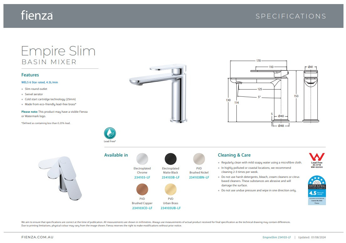 Please note: This product may have a visible Fienza or Watermark logo.