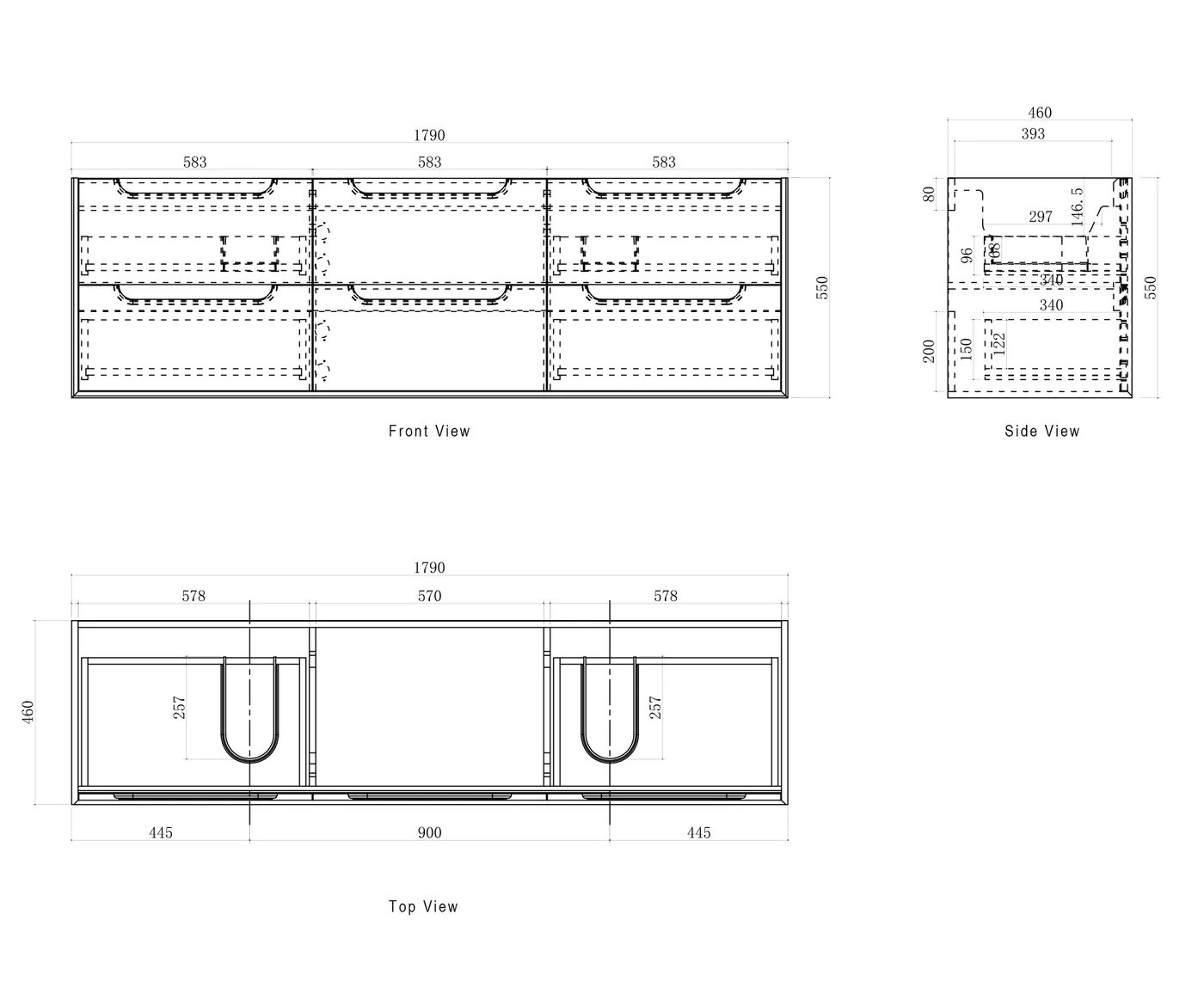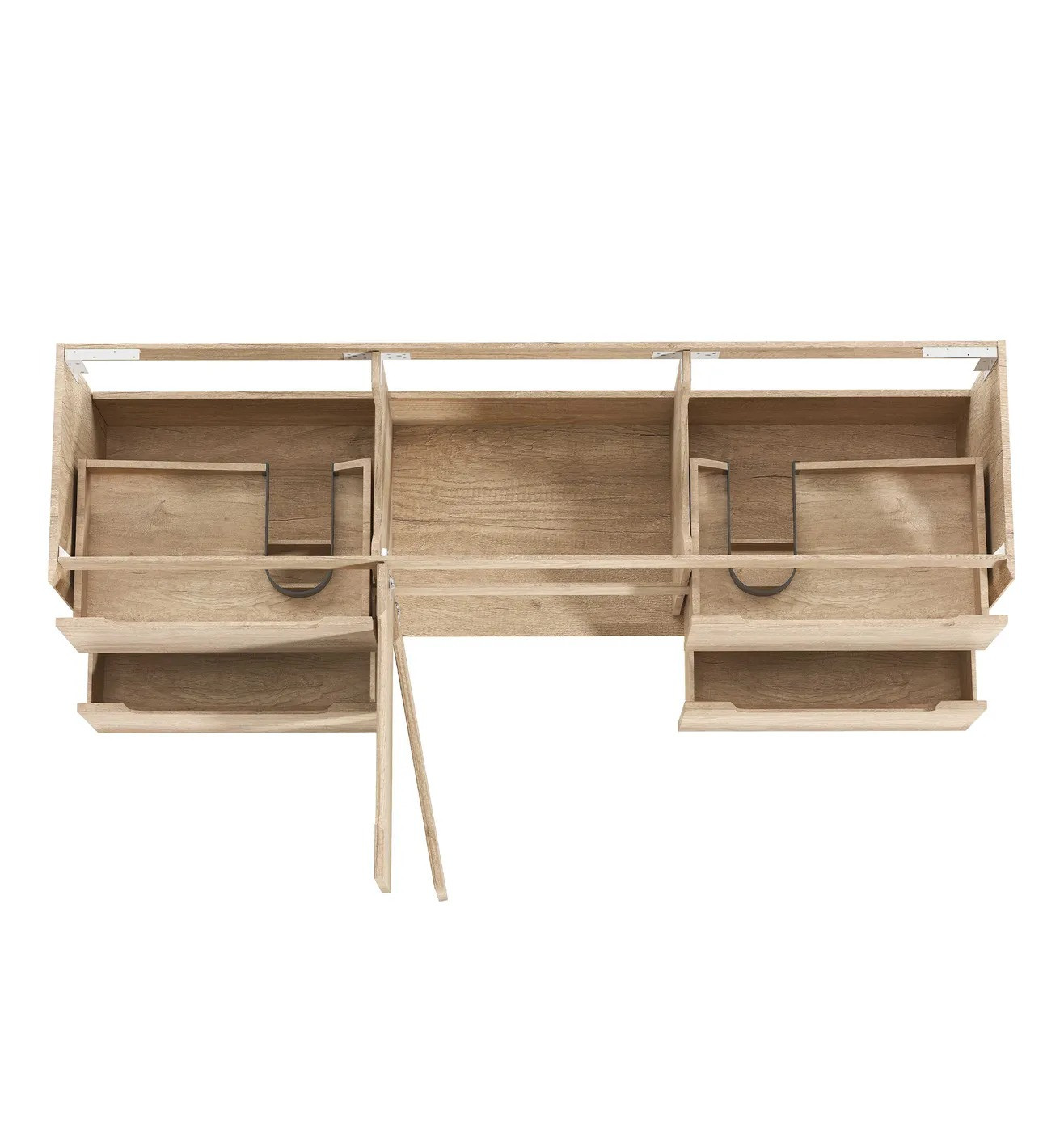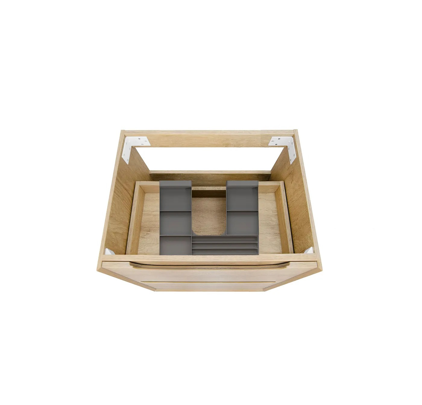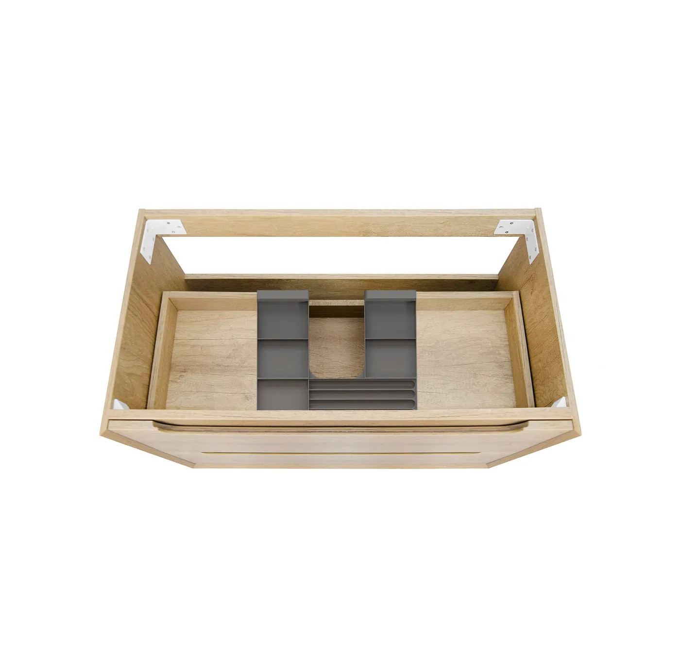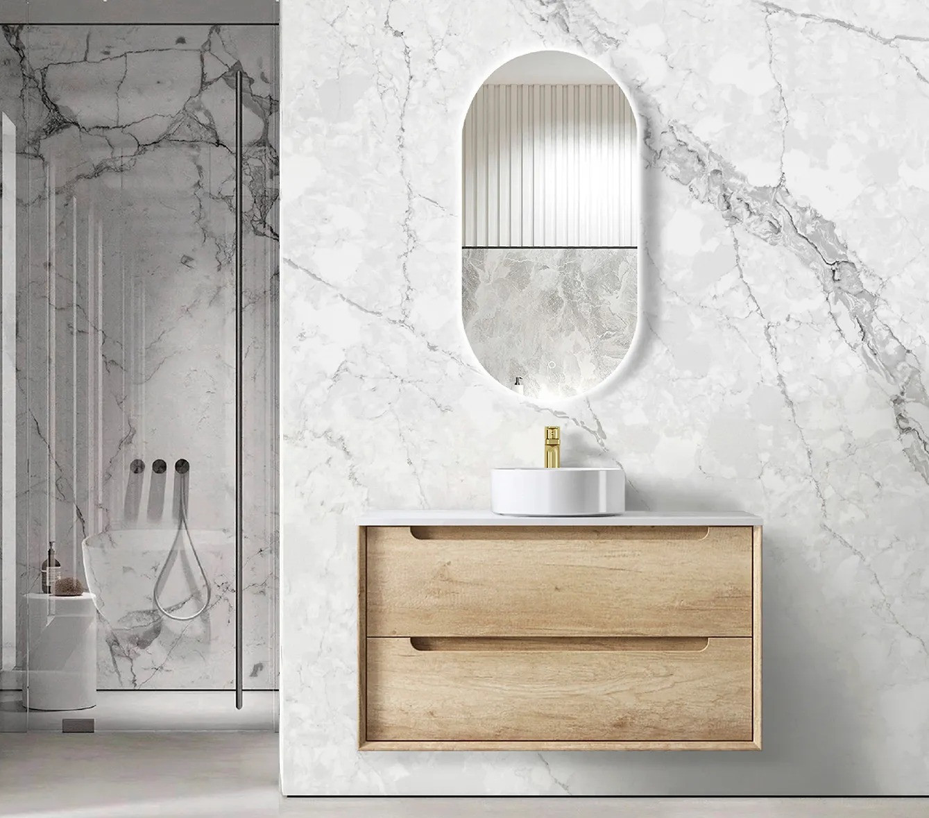 Wall-hung vanity with soft-close drawers, high moisture–resistant plywood construction, oak interior finish, and soft-edge finger pull handles. Fitted with DTC soft-close runners and hinges.