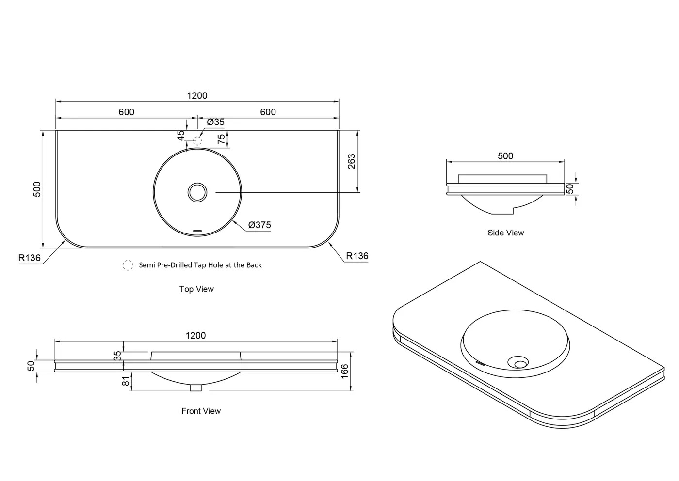 Havana English Edge 1200x500x50 Matte White with Round Basin Top