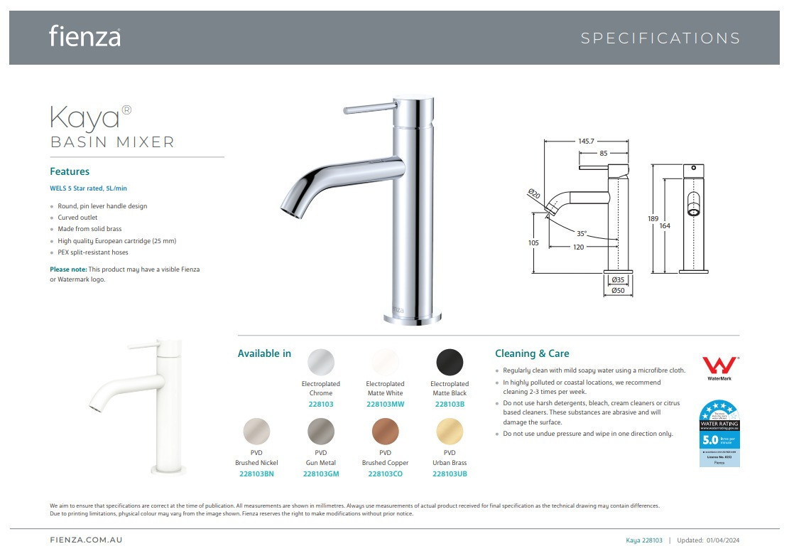 Please note: These products may have a visible Fienza or Watermark logo.