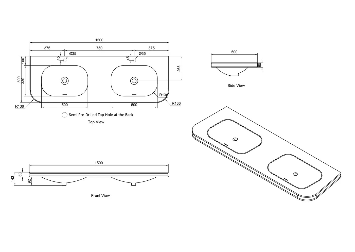 Havana English Edge 1500x500x50 Matte White with Soft Square Basin Top